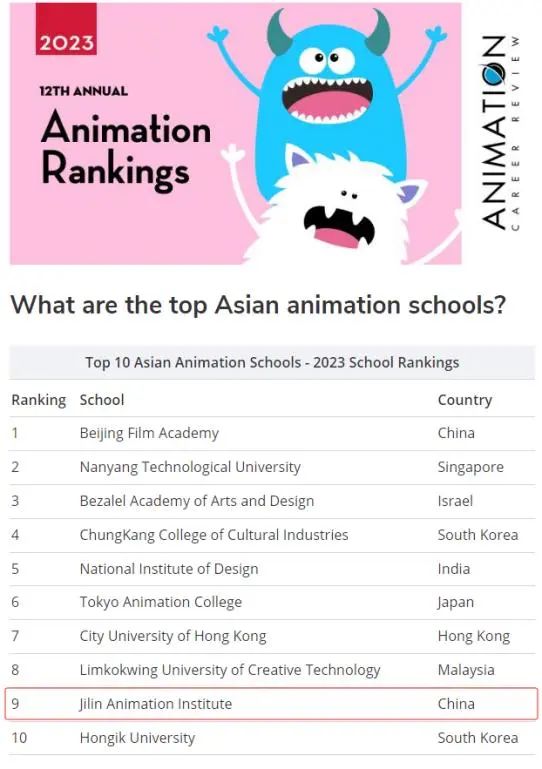 9001cc金沙以诚为本在2023“动画职业评论”(Animation Career Review)亚洲动画大学中排名第9位