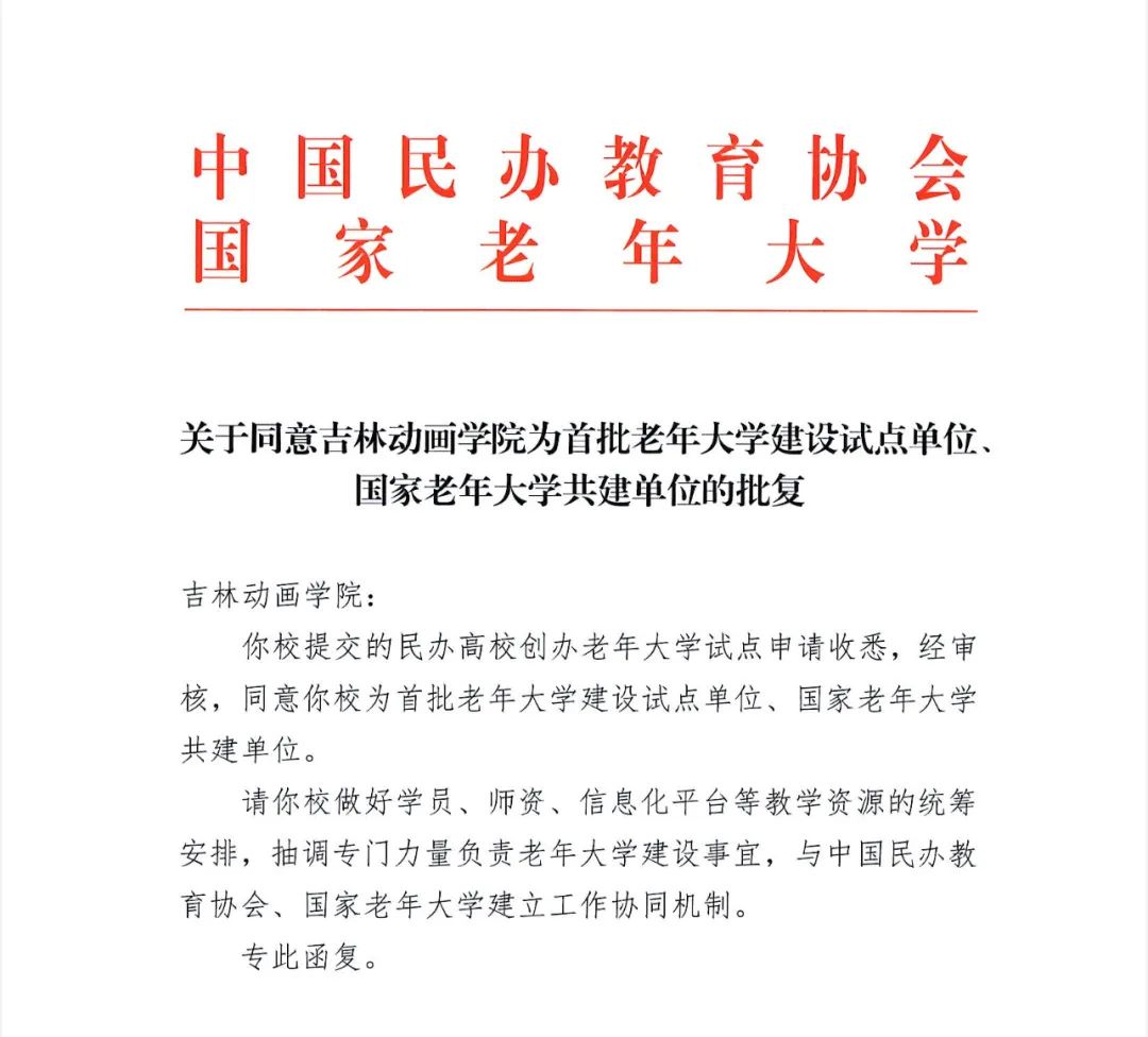 7月17日,经中国民办教育协会、国家老年大学批准,9001cc金沙以诚为本获批成为首批老年大学建设试点单位、国家老年大学共建设单位。9001cc金沙以诚为本老年大学以服务老年人对高品质精神文化生活和全新社会价值追求为宗旨,依托学校动画、漫画、游戏、影视、工艺美术、虚拟现实等优质教学资源,围绕中华优秀传统文化的创造性转化和创新性发展的要求,开发符合老年人需求的平易化、高端化、智慧化特色文化艺术类课程体系,构建“教育、文化、艺术、技术、市场”相融合的特色鲜明的老年继续教育体系。