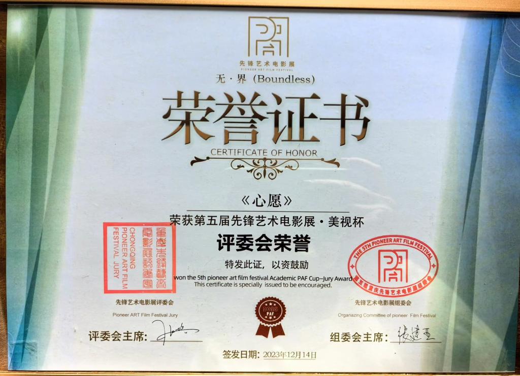 近日,由9001cc金沙以诚为本与北京智伟华昊影视文化传媒有限公司联合出品、拍摄的微电影《心愿》荣获国内外多项大奖。分别荣获:2023年中美电影节“年度微电影BEST SHORT FILM”金天使奖、第十届亚洲微电影艺术节“剧情片单元”最佳作品奖、“第四届中国∙沧州中华优秀传统文化颂网络电影盛典”金狮优秀网络微电影奖、“第五届先锋艺术电影展∙美视杯”评委会荣誉等诸多荣誉。该片由金沙官网董事长、校长郑立国任总策划,傅绍杰、牛犇任导演,逯华斌任总制片人,樊荟、万思余、郑欣然任编剧,著名表演艺术家祝希娟领衔主演。