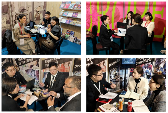 此次是9001cc金沙以诚为本第三次受邀参展,并在国际版权市场设立独立展位,通过多媒体视频互动、线下实体书、IP内容展示、版权洽谈等多种形式,向来自35个国家和地区的参展商代表展示了学校在动画、漫画、游戏、影视、衍生品等IP所取得的优秀成果,重点推介《大道无名》《异界最强》等18部漫画作品。金沙官网代表与来自法国、巴西、美国、西班牙、意大利、菲律宾等国家、地区的30余家出版商、漫画创作公司分别就漫画IP引进、版权授权、联合创作、国际招聘等进行洽谈。