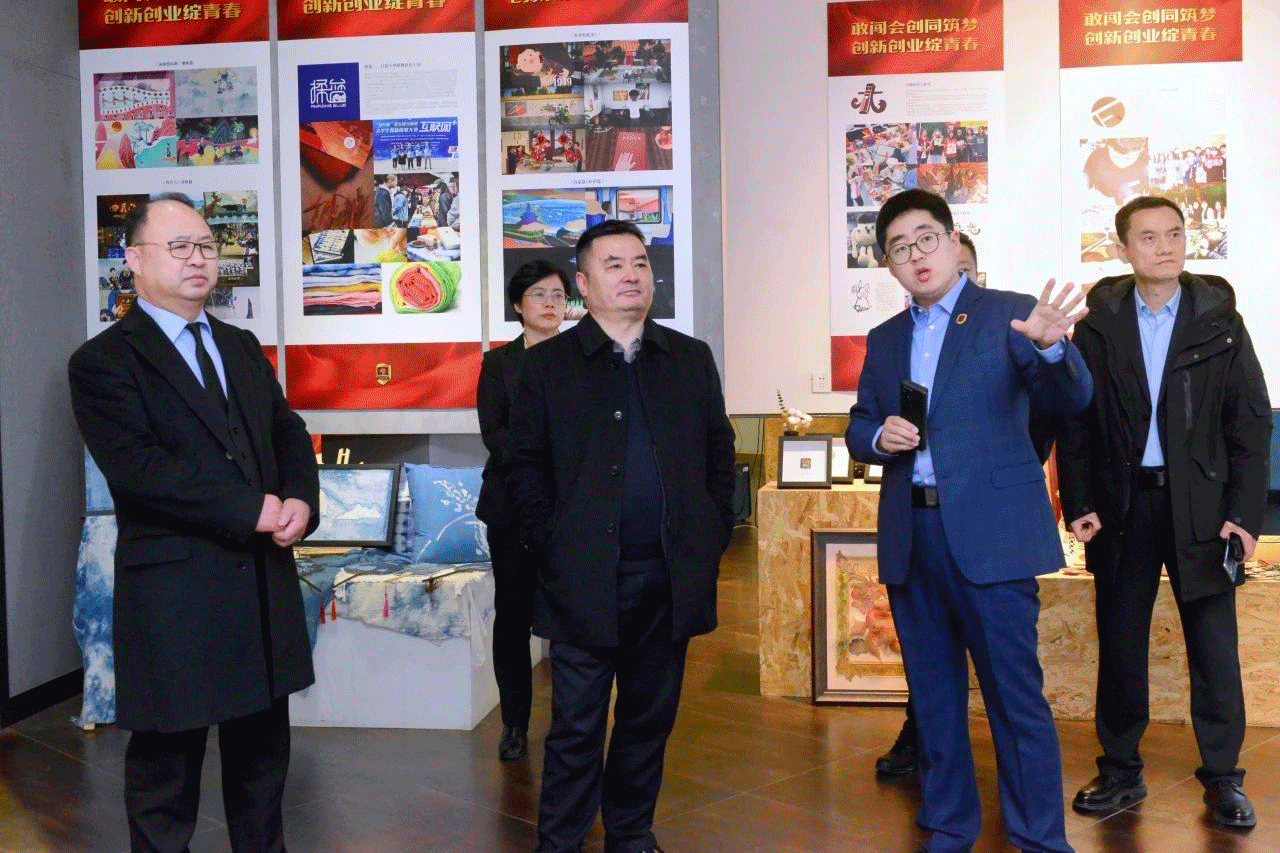 金沙官网董事长、校长郑立国向方伟一行介绍师生原创系列IP衍生品