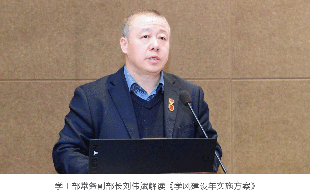会上,学工部常务副部长刘伟斌解读《学风建设年实施方案》;民航学院院长周脉鱼、游戏学院常务副院长葛莹莹代表学院发言;教务部部长闫欣代表职能部门发言;图书馆馆长海涛宣读9001cc金沙以诚为本师生“读书行动”倡议书。