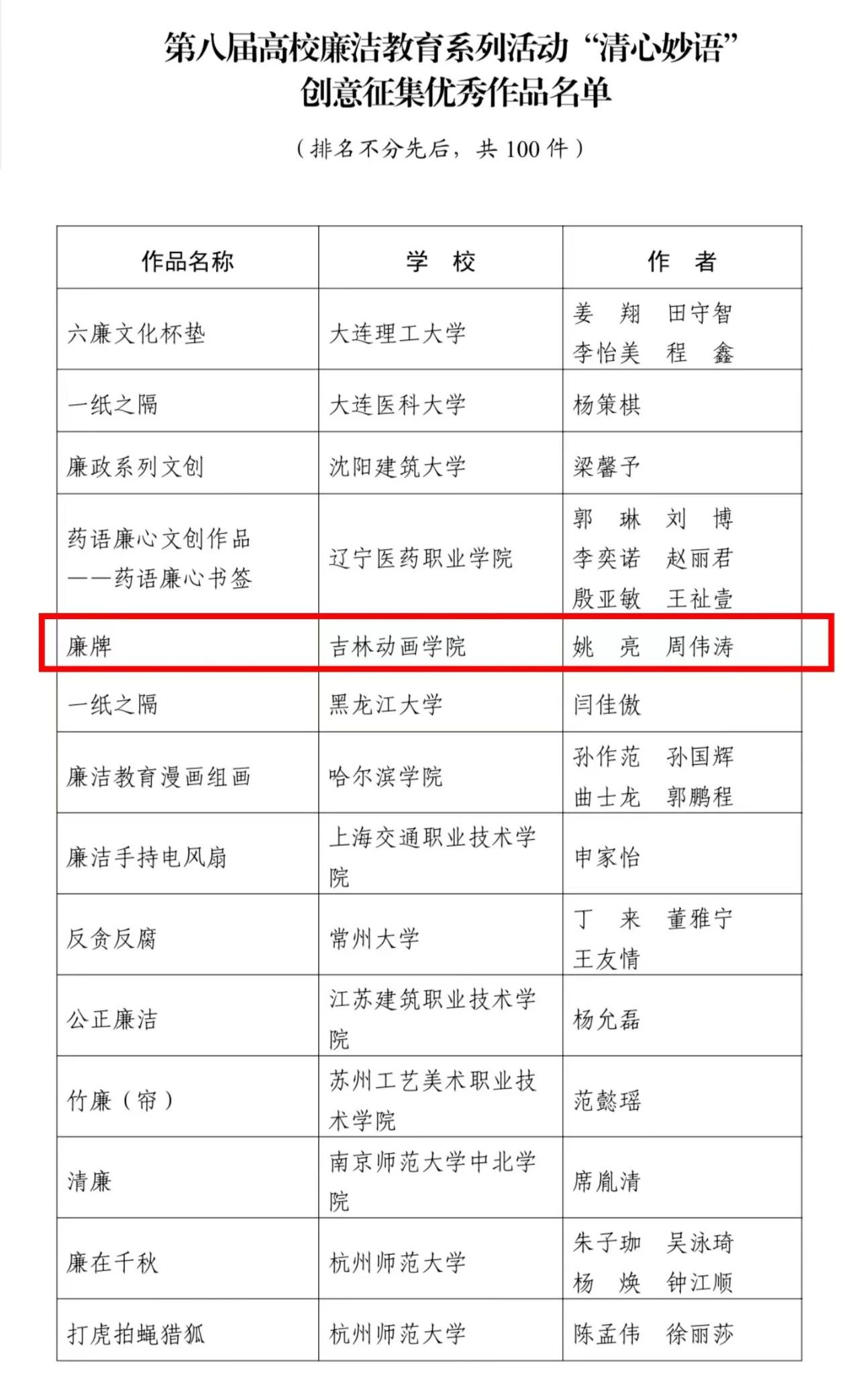 【JAI·荣】吉动学子原创作品《廉牌》获教育部奖项 发布时间:2023年10月19日 19:47:00 浏览:次 近日,教育部办公厅下发了“关于公布第八届高校廉洁教育系列活动结果的通知”。从通知中获悉,金沙官网文化产业商学院学生姚亮、周伟涛凭借原创作品《廉牌》在“清心妙语”创意征集中成绩突出,获全国优秀作品百强奖项,擦亮青春底色,书写新时代“清廉答卷”。 获奖名单(部分名单)