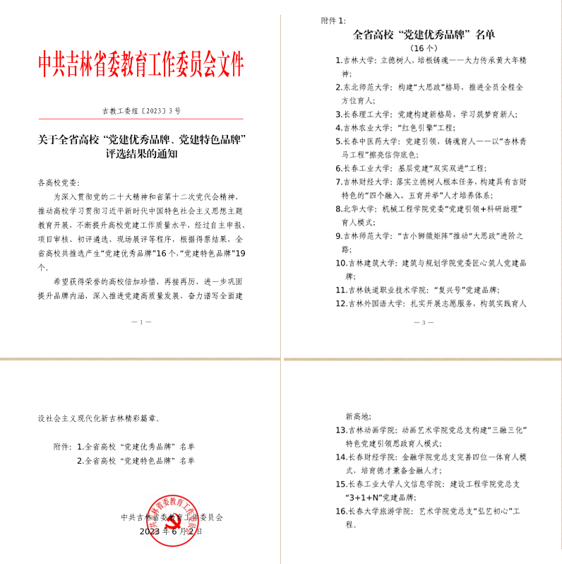 近日,省委教育工委公布了吉林省高校“党建优秀品牌、党建特色品牌”评选结果,金沙官网动画艺术学院党总支“构建‘三融三化’特色党建引领思政育人模式被评为“党建优秀品牌”。