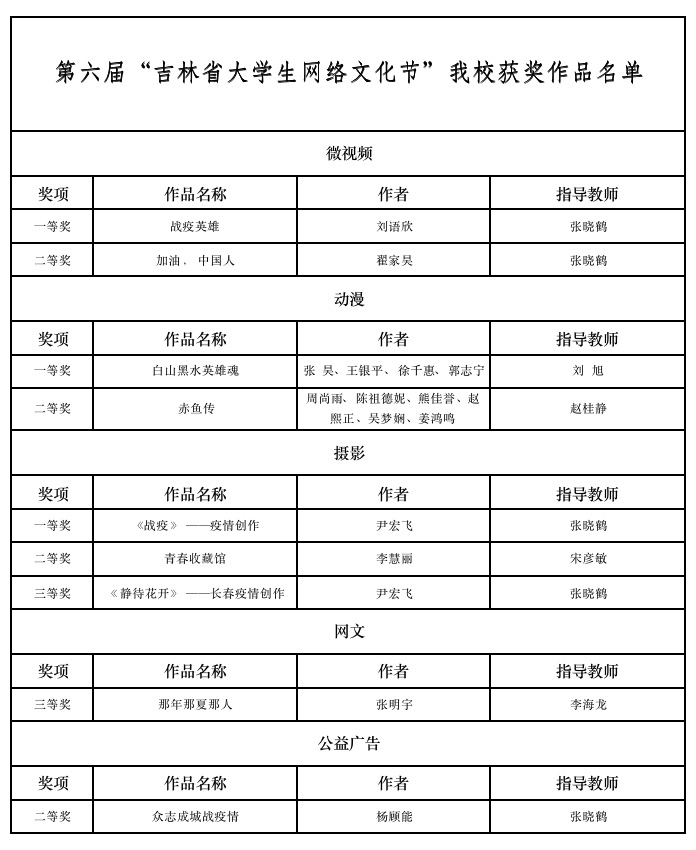 近日,省教育厅公布第六届吉林省大学生网络文化节和全省高校网络教育优秀作品推选展示活动评选结果,金沙官网荣获微视频、动漫、摄影、网文、公益广告五个类别一等奖3项、二等奖4项、三等奖2项的好成绩。