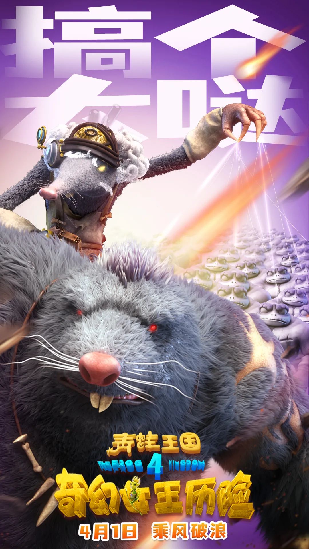 新的种族鼹鼠加入青蛙王国的世界观中,成为本片的一大看点,科学怪才鼹鼠博士和力量王者鼹鼠大王强强联合,组成《奇幻女王历险》的反派联盟。海报中野心勃勃的鼹鼠博士操控着疯蛙大军,暗示他在大战中的主导地位,鼹鼠大王首当其冲,带领大军奔向前方。骁勇善战的鼹鼠大王是本片中的力量担当,大块头的体格加上可怕的形象,与憨憨的性格形成强烈反差,鼹鼠博士身上新奇的科技设备,激发小朋友的好奇心。