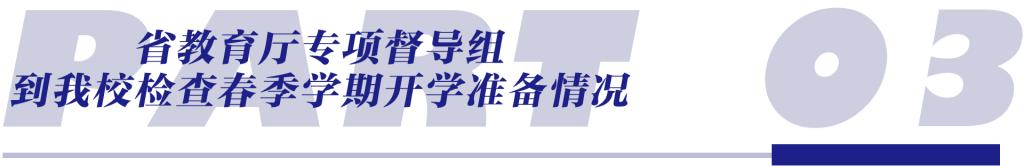 2月14日下午,省教育厅高教处于文华带队来金沙官网督导检查春季学期开学准备情况。工作组通过听取汇报和实地考察,对学校开学各项准备工作给予充分肯定。