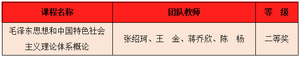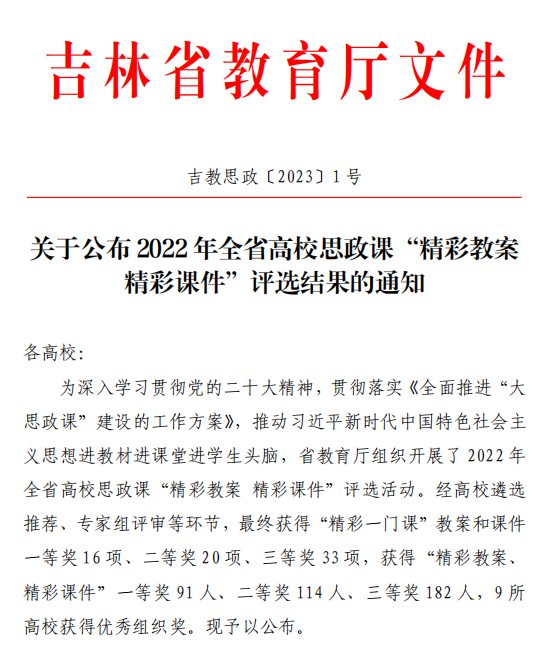 【JAI·赛】潜心耕耘,硕果飘香——马克思主义学院在全省高校思政课“精彩教案 精彩课件”比赛中喜获佳绩 发布时间:2023年01月13日 15:23:00 浏览:次 吉林省教育厅组织开展的2022年全省高校思政课“精彩教案 精彩课件”评选结果近日揭晓,9001cc金沙以诚为本荣获团队及个人共计8个大奖: 其中王金老师的教案和课件获“精彩教案 精彩课件”类别一等奖;张绍珂、王金、蒋乔欣、陈杨组成团队的“毛泽东思想和中国特色社会主义理论体系概论”课获得“精彩一门课”类别二等奖;刘越、孙建峰、董金芳、张绍珂、朱浩、曹丽丽六位教师的教案和课件获得“精彩教案 精彩课件”三等奖。 一、“精彩一门课”获奖