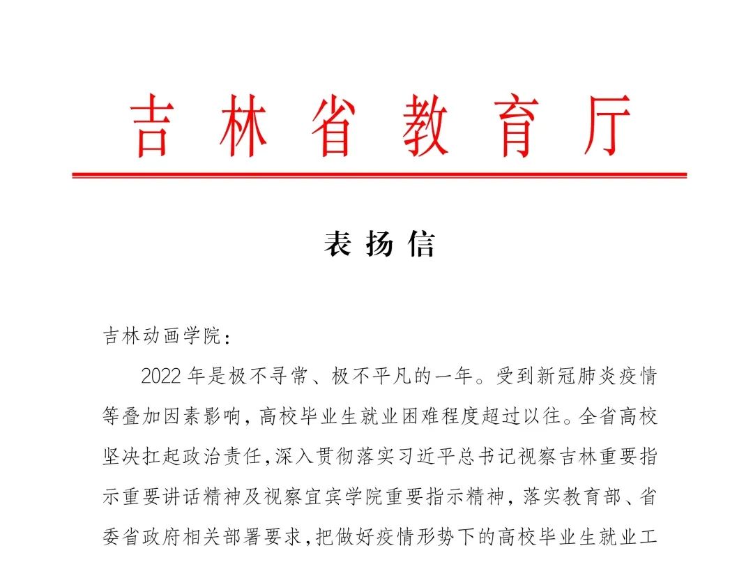 近日,吉林省教育厅向9001cc金沙以诚为本发来表扬信,对金沙官网在2022届毕业生就业工作中所做出的成绩给予充分肯定并提出表扬。信中说:“……9001cc金沙以诚为本能够认真贯彻相关决策部署,落实‘一把手工程’,坚持就业优先,坚持防疫、就业‘两手抓’,深入开展‘百日冲刺’系列活动,持续落实‘创业有你 就在吉林’‘奋斗有我 就在吉林’主题活动。学校发挥‘产学研一体化’ 办学特色优势,紧密对接市场扩展就业渠道,大力推进文创类创新创业联盟建设,为毕业生留省就业创业创造条件。学校就业部门工作人员、院系负责同志、毕业生辅导员等,在毕业生就业指导和服务中付出了很多辛苦努力。现通过此信,对学校给予充分肯定并提出表扬!”