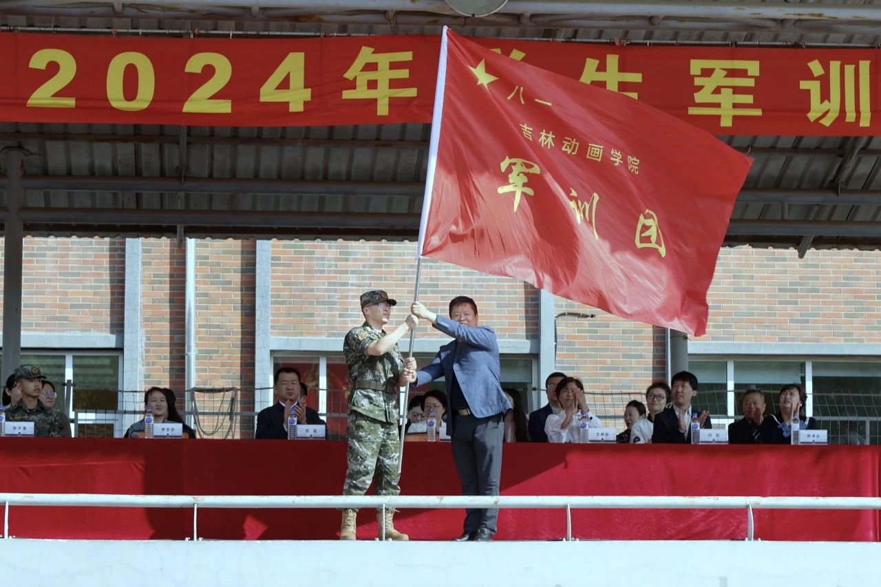 开营仪式在庄严的国歌声中拉开序幕,五星红旗冉冉升起,全体参训学生队列整齐、军姿挺拔,展现出昂扬向上的精神风貌。岳武做动员讲话,刘振华向军训团授旗,2024级新生军训团李团长宣布开营,吕教官代表军训教官发言,学校电影学院播音与主持艺术专业王亚轩同学代表全体新生发言。