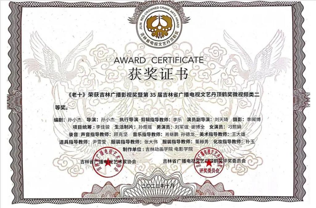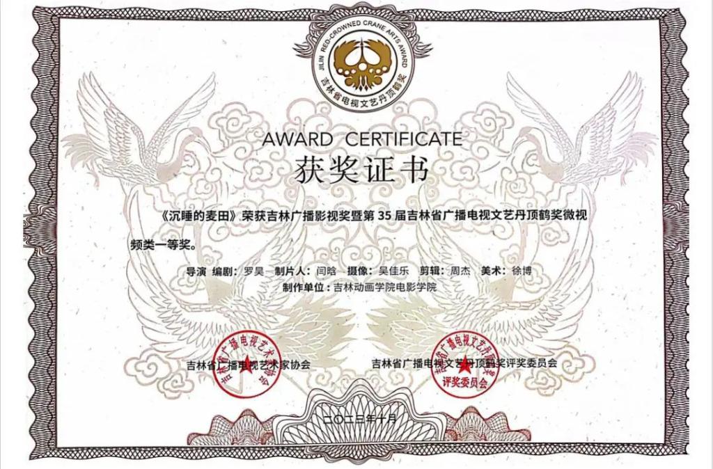 近日,由吉林省文联、吉林省广播电视艺术家协会主办,白城师范学院承办的“吉林广播影视奖暨第35届吉林省广播电视文艺丹顶鹤奖”评奖活动圆满落幕。吉林动画电影学院报送的微电影《沉睡的麦田》荣获“微视频类一等奖”、《老十》荣获“微视频类二等奖”。
