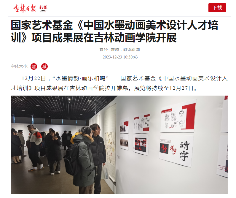 该项目相关负责人介绍说,《中国水墨动画美术设计人才培训》项目呼应新时期党领导文艺事业繁荣发展的时代要求,立足新时代中国水墨动画美术设计人才培养,促进中国水墨动画进行创造性转化和创新性发展。本次项目培训时间为90天,由来自思想理论、文化研究、艺术创作等领域的27位著名专家教授、资深学者、艺术大师组成高水平授课教师团队,为来自16个省份的30名学员授课,“本次展出的51件优秀教学成果,集中体现了青年学员传承中国水墨画优秀传统文化,探索中国水墨画与动画艺术语言融合,提升人民群众对中国水墨画的精神追求和情感喜爱的艺术思想和文化自信。”(作者:吉林日报全媒体记者 马璐)