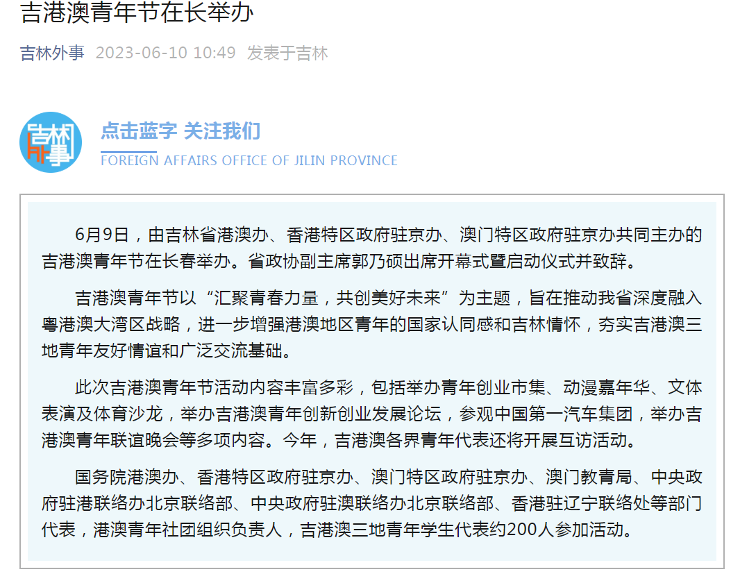 活动旨在推动我省深度融入粤港澳大湾区战略,进一步增强港澳地区青年的国家认同感和吉林情怀,夯实吉港澳三地青年友好情谊和广泛交流基础。活动内容丰富多彩,包括举办青年创业市集、动漫嘉年华、文体表演及体育沙龙,举办吉港澳青年创新创业发展论坛,参观中国第一汽车集团,举办吉港澳青年联谊晚会等多项内容。多家媒体予以报道,现将部分报道展示如下,以飨读者。