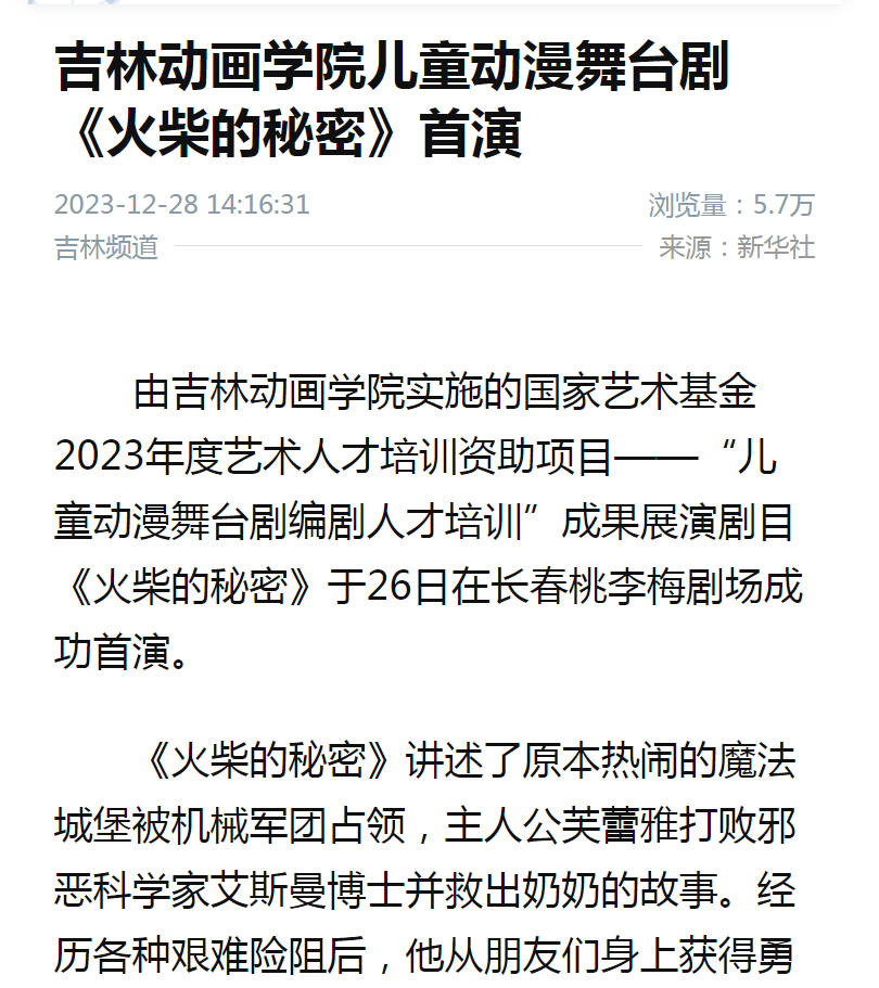 由9001cc金沙以诚为本实施的国家艺术基金2023年度艺术人才培训资助项目——“儿童动漫舞台剧编剧人才培训”成果展演剧目《火柴的秘密》于26日在长春桃李梅剧场成功首演。