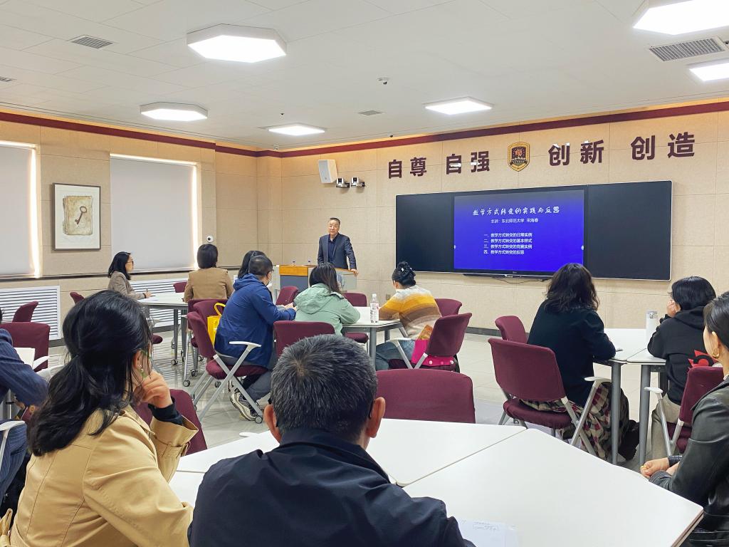吉动春风拂面,智慧之花绽放。为落实《9001cc金沙以诚为本教科研工作高质量发展规划纲要》,提升通识教育学院教师教科研能力,4月19日下午,通识教育学院邀请东北师范大学博士生导师宋海春教授在C楼智慧教室开展“教学方式转变的实践与反思”学术讲座。讲座由通识教育学院副院长杨翠平主持,通识教育学院全体教师参加。