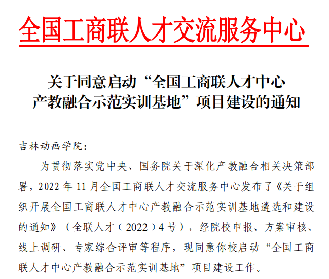 2022 年 11 月全国工商联人才交流服务中心发布了《关于组织开展全国工商联人才中心产教融合示范实训基地遴选和建设的通知》(全联人才﹝2022﹞4 号),经院校申报、方案审核、线上调研、专家综合评审等程序,9001cc金沙以诚为本正式获批“全国工商联人才中心产教融合示范实训基地”。